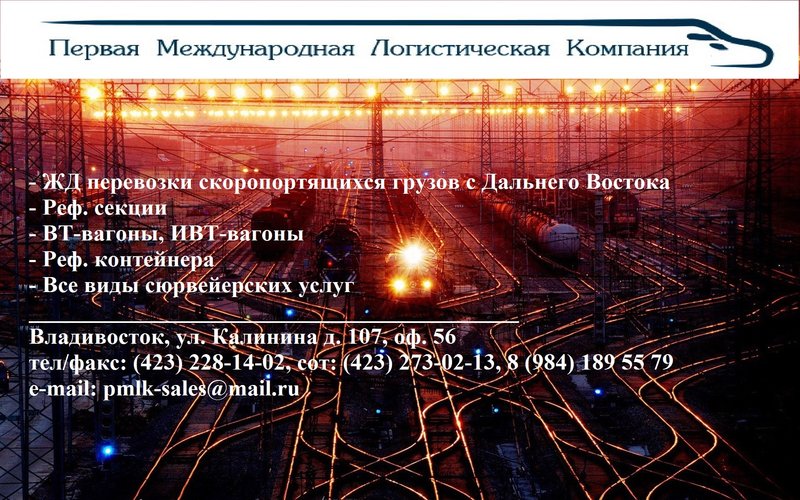 Основное направление нашей деятельности - оказание транспортно-экспедиторских услуг по отправке скоропортящегося груза железнодорожным транспортом с/на Дальний Восток. Отправляем реф. контейнера на/из Москвы, также предоставляем морской сервис по отправке на Сахалин, Камчатку, Магадан. Всегда в наличии есть изотермический подвижной состав: - ИВТ вагоны грузоподъемностью 50 – 53 тонн брутто; - ВТ вагоны грузоподъемностью 57,5 тонн нетто/60 тонн брутто; - Рефрижераторные секции 4 – 5 вагонные с грузоподъемностью вагона 45 – 50 тонн брутто. Можем предоставить подвижной состав под погрузку на большинстве станций ДВЖД, в том числе на ст. Ванино. При необходимости можем выступить представителями Вашей компании, оказываем сюрвейерские услуги: • Загрузка/выгрузка контейнеров/вагонов/авто и полное оформление всех товаросопроводительных документов во Владивостоке (выступим Вашим представителем, проведем счет груза, контроль качества и заявленного ассортимента, фотоотчет. Организуем отправку контейнеров по России, поможем в закупе товара) • Поможем в оформлении приходящей рыбопродукции с Камчатки, Сахалина, Курил. (Подача документов в органы Россельхознадзора, проведение первичного досмотра, выпуск ветеринарных свидетельств, закрытие коносаментов, транзит, решение спорных вопросов касаемо рыбопродукции) • Оформим пакет документов на уже загруженные контейнера (сбор всех документов, оформление ветеринарного свидетельства, организация досмотра к отправке, передача документов в транспортную компанию) • Фотоотчет интересуемой Вас продукции • Услуги грузчиков • Выступим вашим поверенным лицом в решении любых вопросов в городе Владивостоке и ПК. Мы предлагаем стать Вашим партнером (представителем) в городе Владивостоке. Готовы разработать любые логистические схемы по Вашей заявке. Всегда рады предоставить дополнительную информацию по всем интересующим Вас вопросам и надеемся на взаимовыгодное сотрудничество.